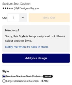 10-15-2025 Stadium Seat CushionsMedium size is "Temporarily sold out"Note from Fiona on 11/05/2024: "OOS awaiting inventory, and no ETA has been provided." |